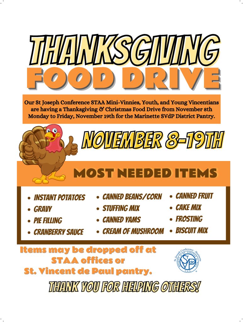 St. Joseph SVDP Youth Conferences are coordinating a Thanksgiving & Christmas Food Drive from November 8th to November 19th. All items collected will help keep the pantry shelves full at the SVDP Marinette Pantry at 2000 Cleveland Avenue.